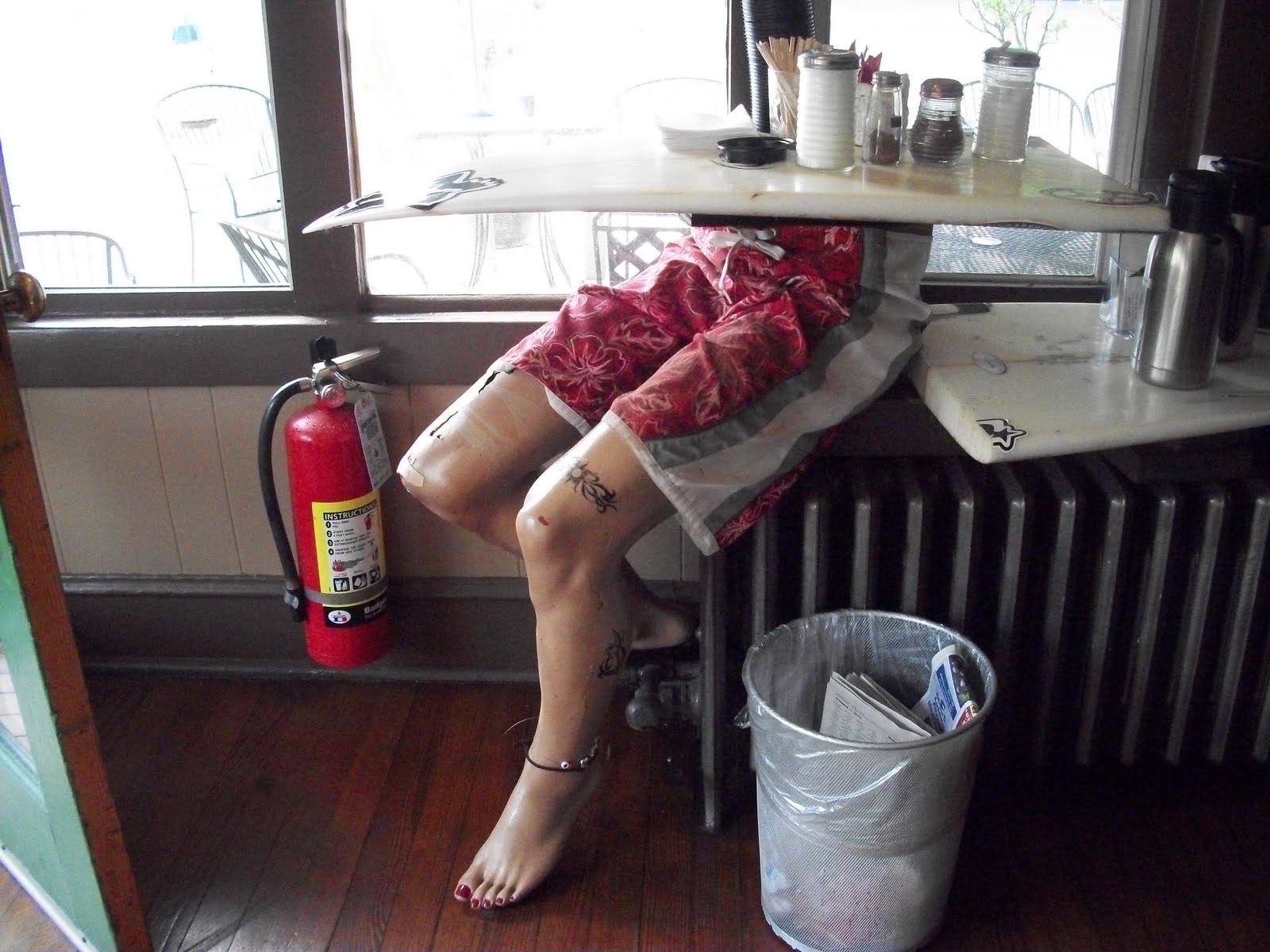 It’s an eclectic-looking corner shop; painted in eye-catching colors. Walk in the door and immediately catch a glimpse of their ‘fixins bar’—fixins for beverages that is. It’s a piece of surfboard anchored above some surfer legs. Just genius decor for it’s location. Turn around and face your conscience. A glass pastry case holds some great offerings for breakfast or anytime snack—-chocolate and ricotta muffins, fennel and ricotta muffins, berry dotted concoctions, giant chocolate chip cookies.