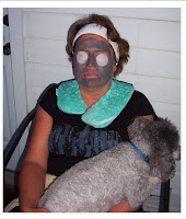 Of course, in order to get ourselves gorgeous, we all had to temporarily put aside any vanity, as you can see by the photos, right and below. (Yes, that’s our own Pat Achilles, being a wonderful sport at right. And Chrysa Smith is definitely in the zone, along with poodle Bobby, below.) But as long as we didn’t look in any mirrors, the entire experience helped cultivate some serious inner zen. Spending time with friends is always a pick-me-up. Adding in some personal pampering makes it even better. And a Spa night on a Tuesday? Sheer heaven!
