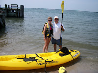 And we were off. Despite my healthy respect for/fear of the ocean, I dipped my paddle in the Atlantic, first one side, then the other, as we sailed over the breakers, heading further and further from shore. In no time, the sounds of children splashing at the water’s edge faded until the only things audible were the gentle slap of the water against the side (if you could call less than two feet of plastic a side) of the kayak and the slip of the paddles in and out of the water.