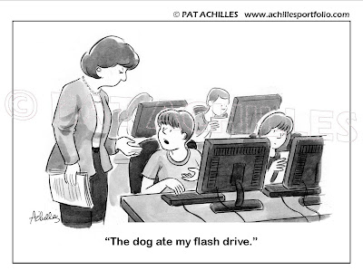 Pat, my friend, also named Mary Fran, is a librarian for Penn State and said your cartoon hit home with her. Said she’s always finding flash drives left by students in computers. She’s had to resort to surreptitiously spying to identify the owner so she can return the equpiment. Flash drive espionage!