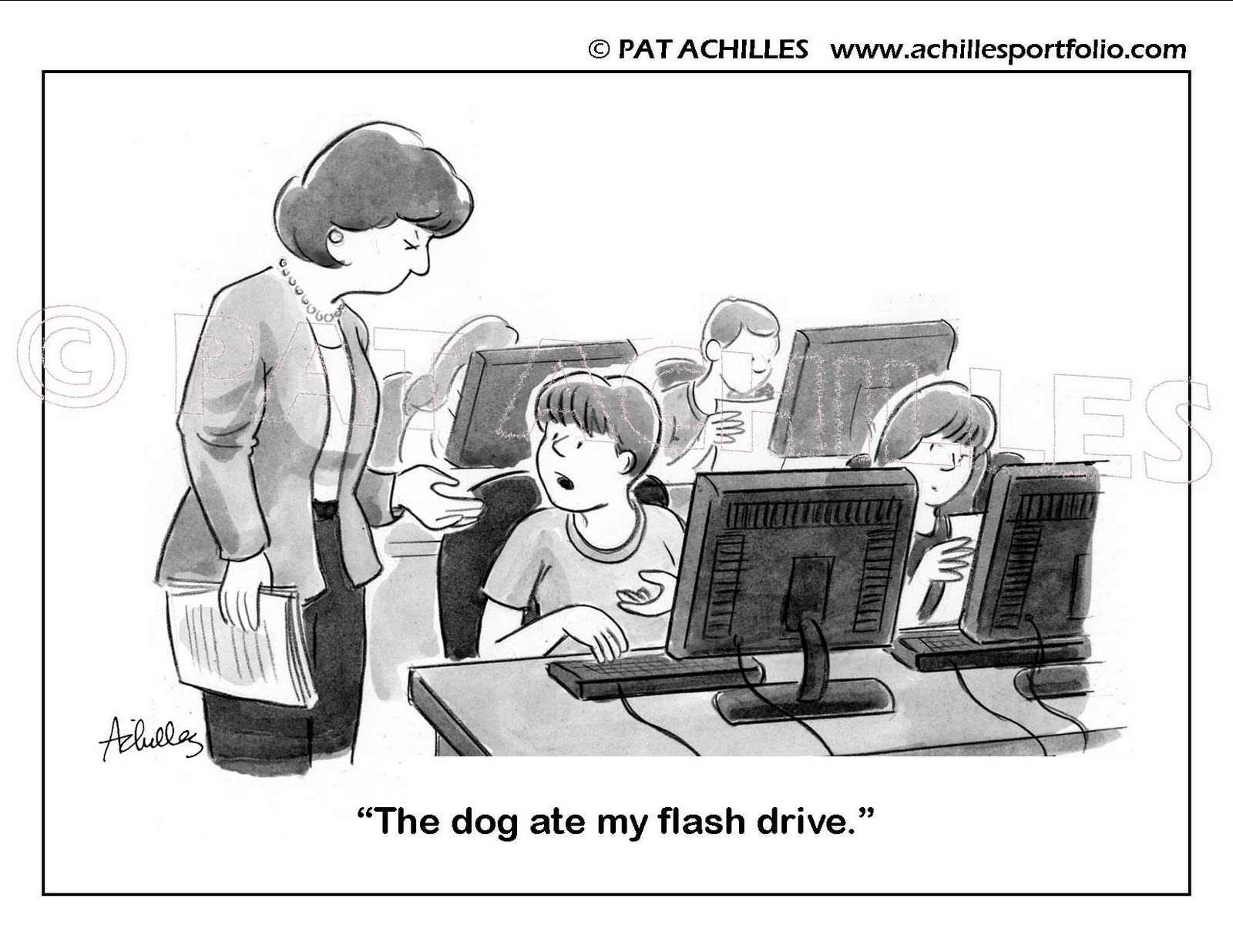 Pat, my friend, also named Mary Fran, is a librarian for Penn State and said your cartoon hit home with her. Said she’s always finding flash drives left by students in computers. She’s had to resort to surreptitiously spying to identify the owner so she can return the equpiment. Flash drive espionage!