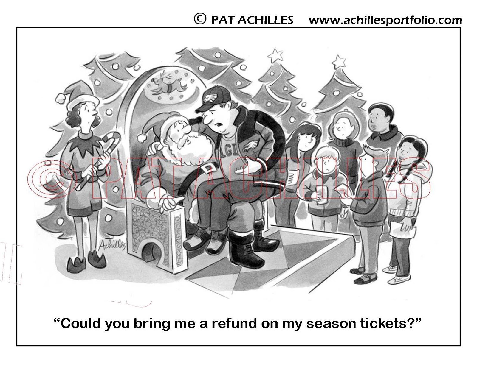 I have this cartoon available as a Christmas card ($2 per card with envelope, or a box of 8 for $12) – just email me at patachilles@aol.com to order. Check my website www.achillesportfolio.com for other sports-related holiday cards, funny Christmas cards and Hanukkah cards!